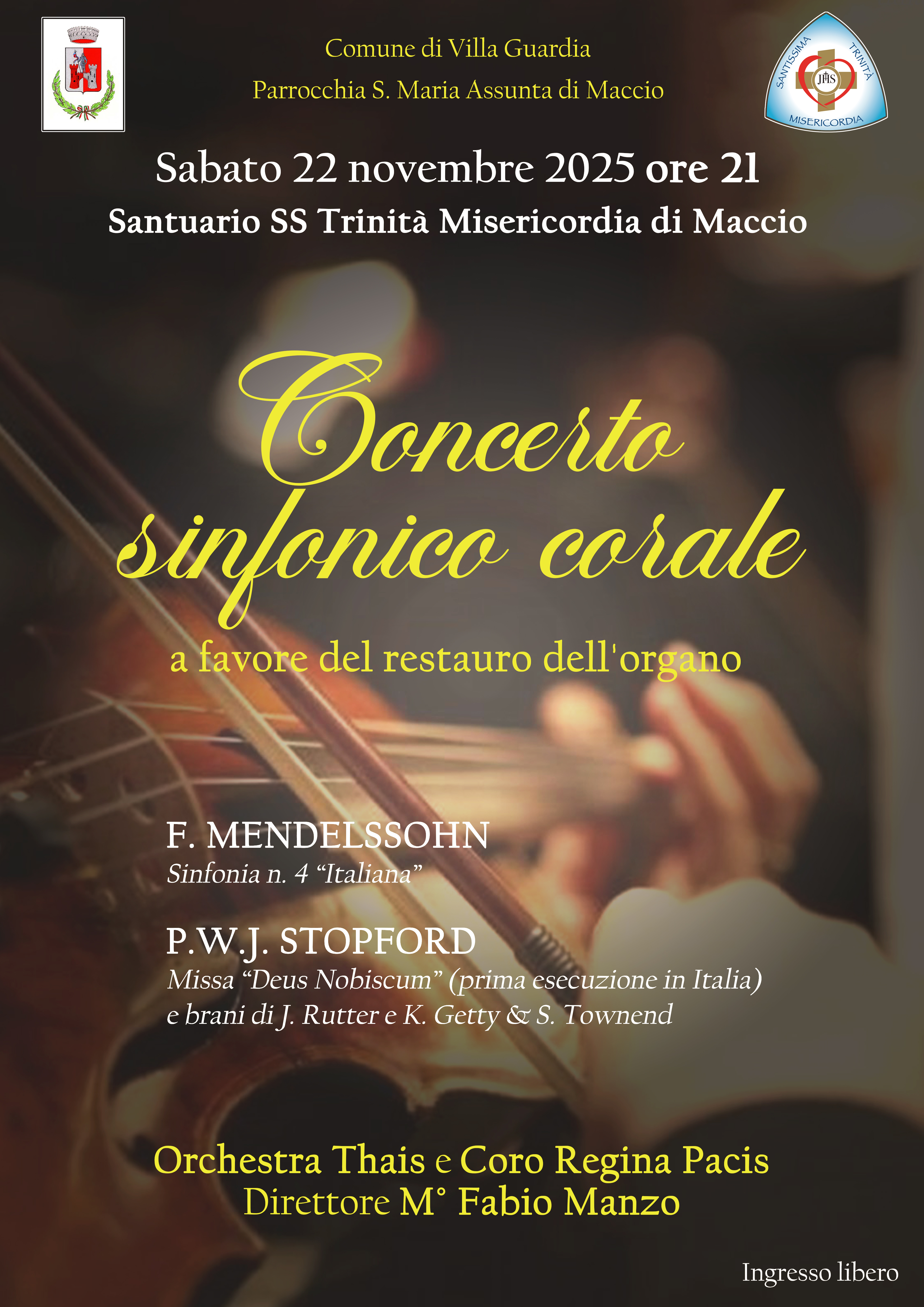 Il concerto, che vede il patrocinio del comune di Villa Guardia e della Parrocchia di Maccio, rappre senta la prima di una serie di manifestazioni volte a raccogliere i fondi necessari per il restauro del l'organo del Santuario. Lo strumento, ad alto valore storico, non è più utilizzabile dal 1994 e sarà sottoposto ad un restauro integrale (ad opera dell'organaro Ilic Colzani) che lo riporterà al suo splendore iniziale.