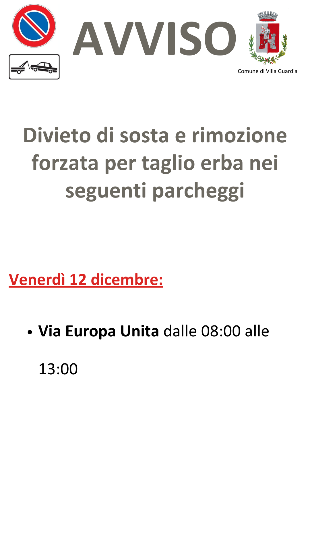 Si informano i cittadini che sono previsti i seguenti interventi di taglio dell’erba nei parcheggi comunali. Pertanto negli orari indicati verrà istituito il divieto di sosta con rimozione forzata.
