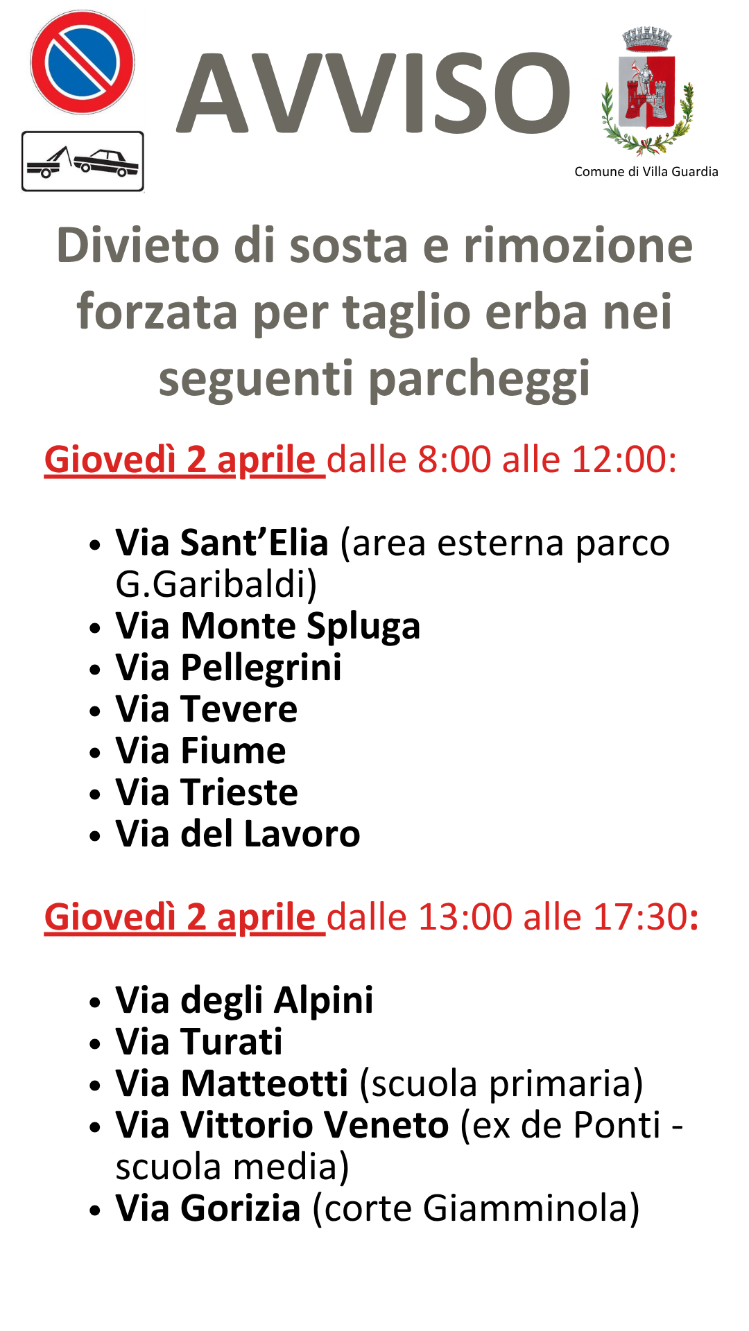 Si informano i cittadini che sono previsti i seguenti interventi di taglio dell’erba nei parcheggi comunali. Pertanto negli orari indicati verrà istituito il divieto di sosta con rimozione forzata.