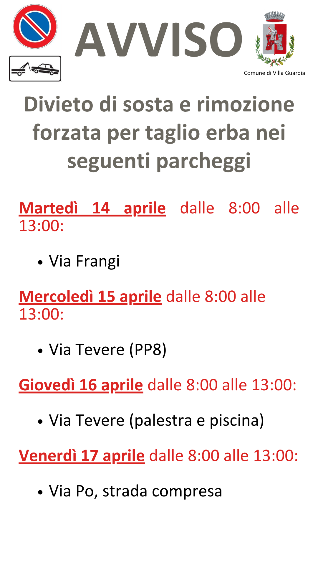 Si informano i cittadini che sono previsti i seguenti interventi di taglio dell’erba nei parcheggi comunali. Pertanto negli orari indicati verrà istituito il divieto di sosta con rimozione forzata.