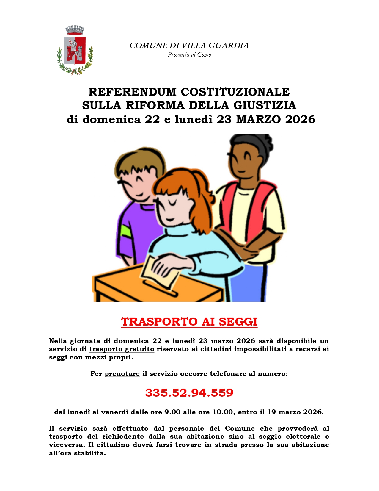Nella giornata di domenica 22 e lunedì 23 marzo 2026 sarà disponibile un servizio di trasporto gratuito riservato ai cittadini impossibilitati a recarsi ai seggi con mezzi propri.