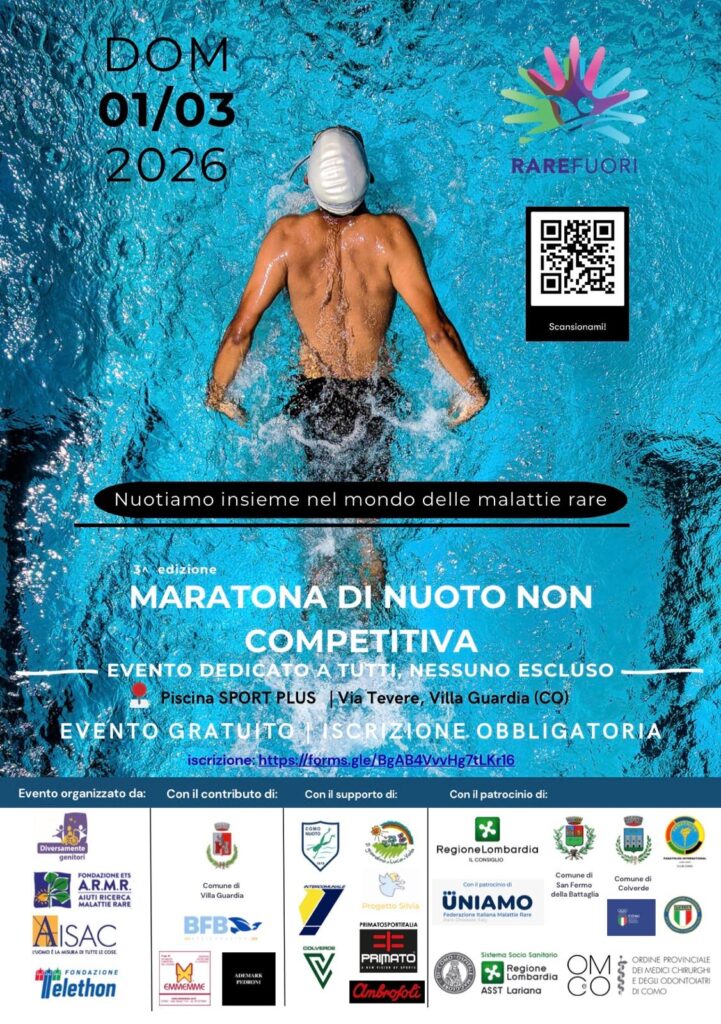 Domenica 1 marzo dalle 8:30 alle 15, presso le piscine Sport Plus di Villa Guardia in via Tevere, vi aspettiamo con Rare Fuori: Diversamente Genitori, AISAC, ARMR e Telethon insieme per affrontare il mondo delle malattie rare… anche a nuoto!